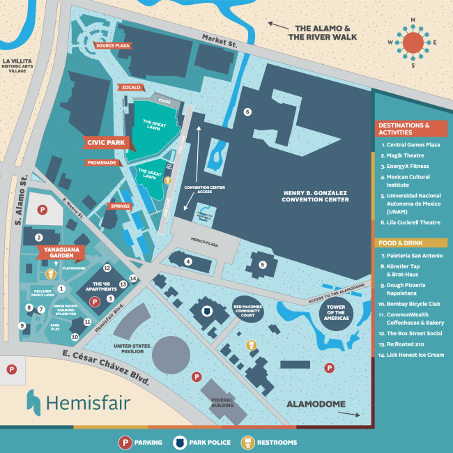 Hemisfair parking is available at several lots located nearby. Please be courteous of other drivers and cautious of pedestrians (especially little ones) while you search for parking. Be aware that parking rates and availability vary with special events.